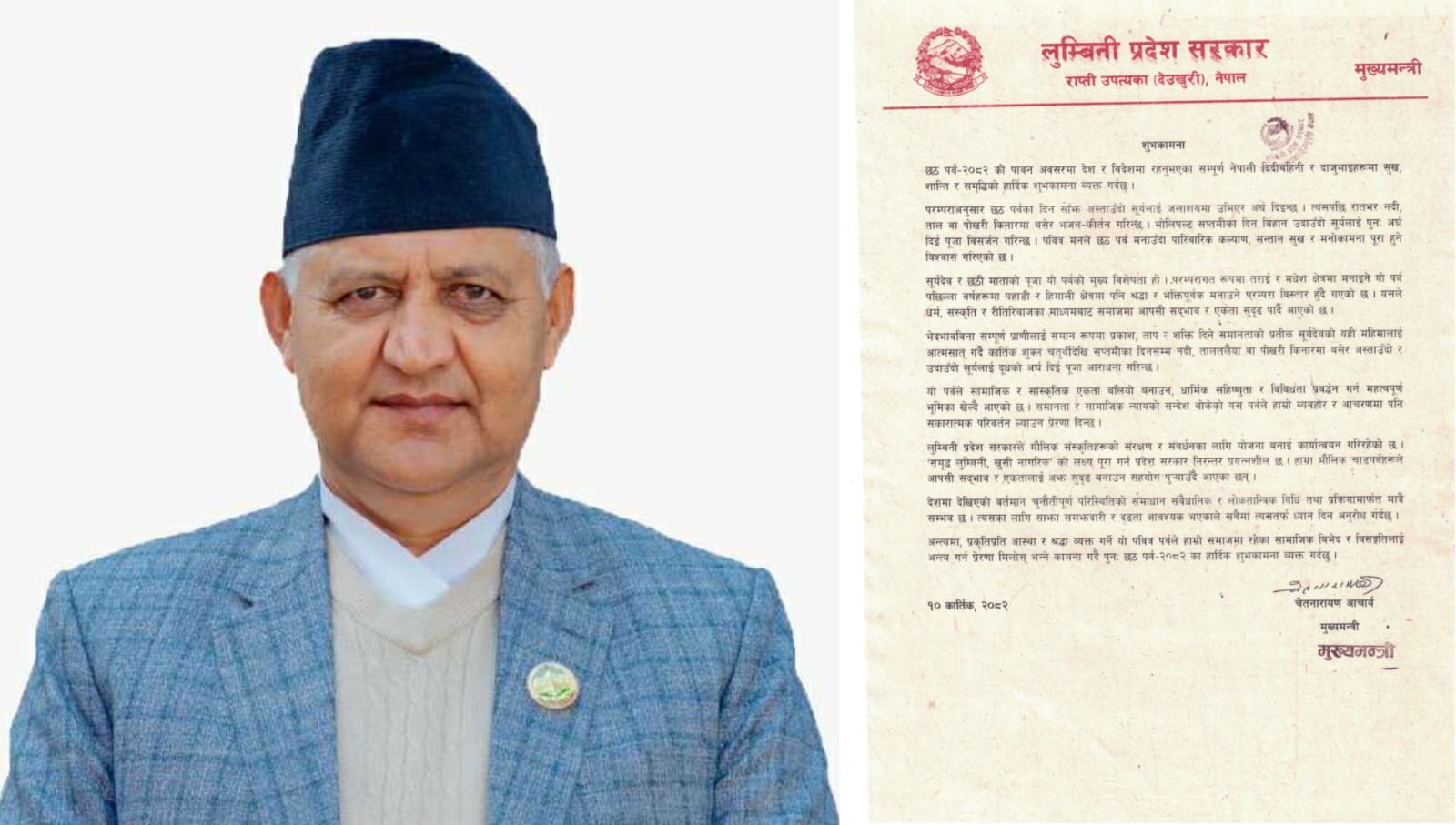दाङ ,१० कात्तिक । लुम्बिनी प्रदेशका मुख्यमन्त्री चेतनारायण आचार्यले छठ पर्वले सामाजिक एकता, समानता र सद्भाव सुदृढ बनाउन महत्वपूर्ण भूमिका खेल्दै आएको बताउनुभएको छ । उहाँले धार्मिक सहिष्णुता, सांस्कृतिक विविधता र सकारात्मक व्यवहारको विकासमा पनि यस पर्वले प्रेरणा दिएको उल्लेख गर्नुभएको हो ।