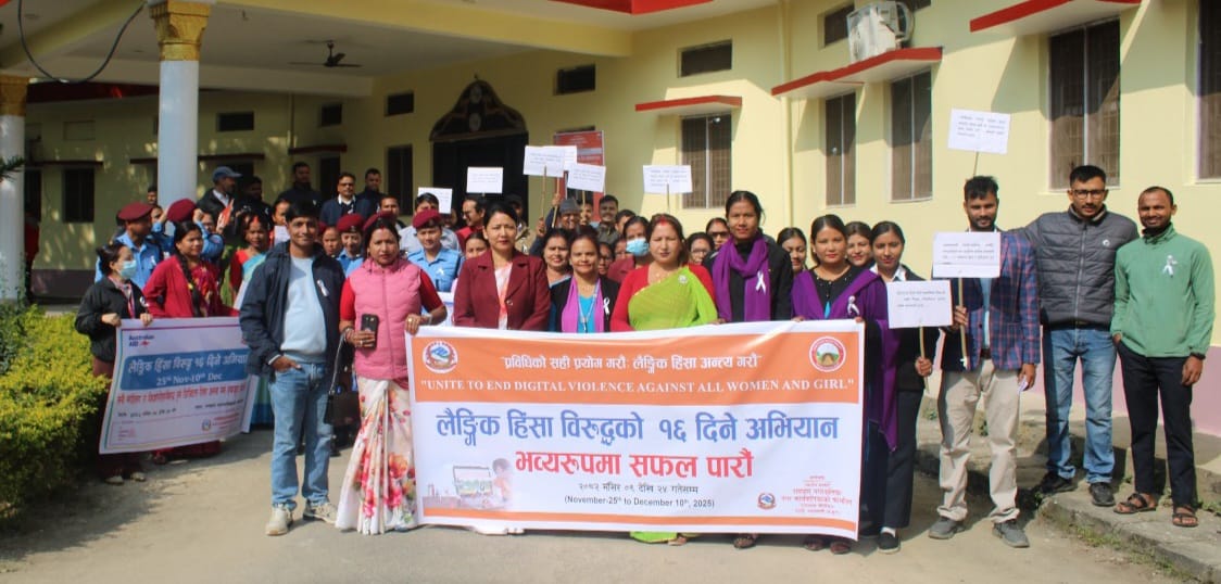 परासी, ९ मंसिर । पश्चिम नवलपरासीको रामग्राम नगरपालिकामा आजदेखि ‘लैंगिक हिंसा विरुद्धको १६ दिने अभियान’ सुरु गरिएको छ। नगरपालिकामा सञ्चालित लैंगिक हिंसा रोकथाम तथा प्रतिकार्यका लागि एकिकृत सेवा पहुँच परियोजनाको आयोजनामा सुरु गरिएको अभियान सचेतनामूलक र्यालीसहित उद्घाटन गरिएको थियो ।